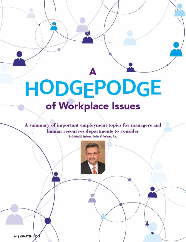A HODGEPODGE of Workplace Issues A summary of important employment topics for managers and human resources departments to consider By Michael P. Spellman, Sniffen & Spellman, P.A. 64 | QUARTER 1 2015