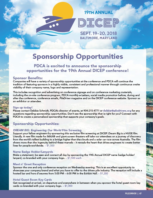 after the conference, conference emails, PileDriver magazine and on the DICEP conference website. Sponsor as