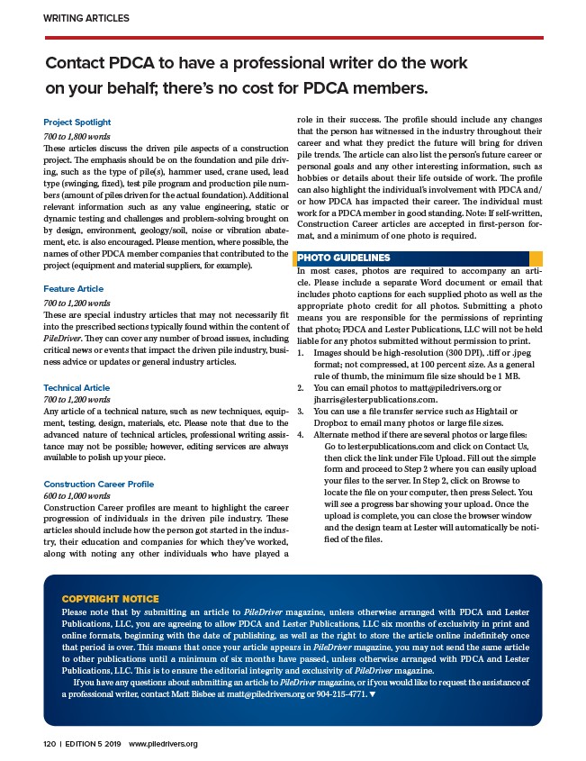 Please note that by submitting an article to PileDriver magazine, unless otherwise arranged with PDCA and Lester