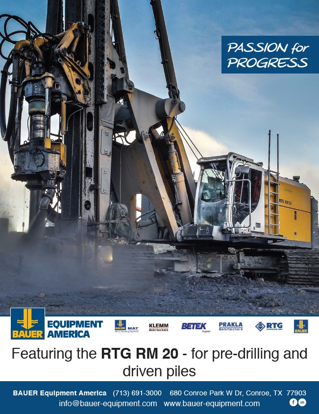 Featuring the RTG RM 20 - for pre-drilling and driven piles BAUER Equipment America (713) 691-3000 680 Conroe Park W Dr, Conroe, TX 77903 info@bauer-equipment.com www.bauer-equipment.com
