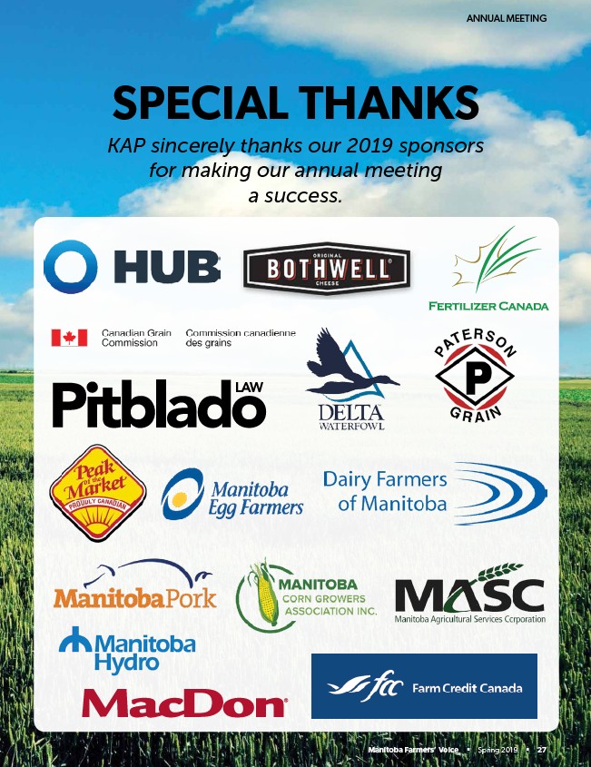 ANNUAL MEETING SPECIAL THANKS KAP sincerely thanks our 2019 sponsors for making our annual meeting a success. Manitoba Farmers’ Voice § Spring 2019 § 27