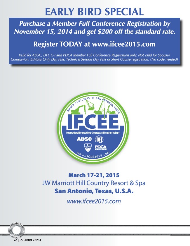 MA R C H 17 - 2 1 , 2 01 5 ★ S A N A N TO N I O , T E X AS International Foundations Congress and Equipment Expo w w w . I F C E E 2 0 1 5 . c o m 12 IFCEE 2015 CONFERENCE PREVIEW 60 | QUARTER 4 2014