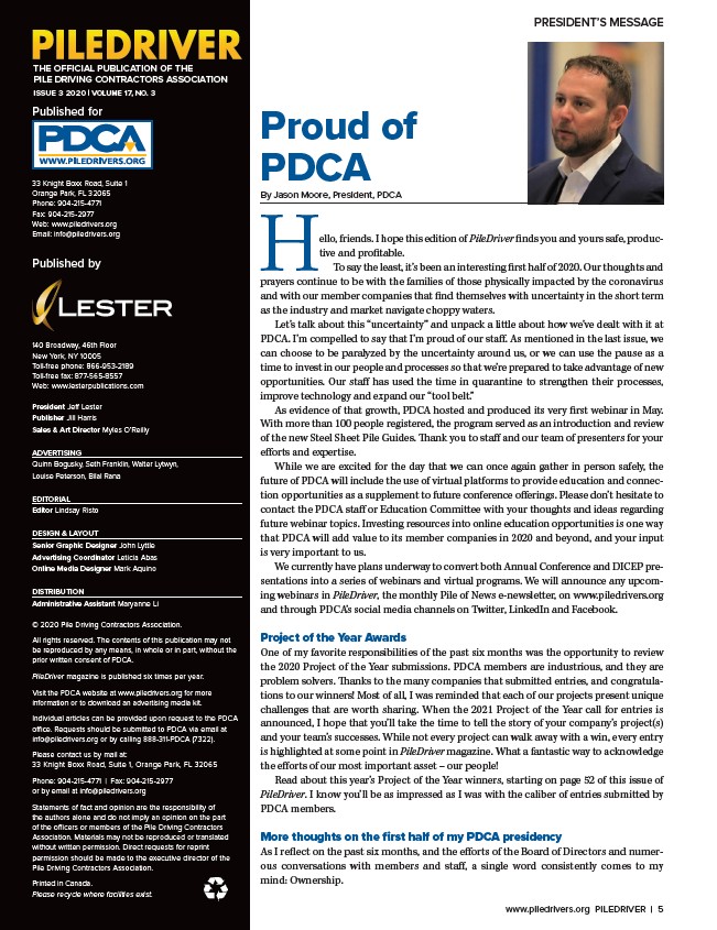 By Jason Moore, President, PDCA Hello, friends. I hope this edition of PileDriver finds you and yours safe, productive